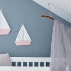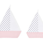 Die Segelboote sind zwischen 36 und 42 cm groß, bestehen Aussen aus 100% Baumwolle und sind in der Waschmaschine waschbar. Damit sie stabil und steif an der Wand hängen sind sie von Innen zusätzlich mit leichtem Vlies verstärkt. Inhalt: 2 Segelboote.