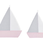 Die Segelboote sind zwischen 36 und 42 cm groß, bestehen Aussen aus 100% Baumwolle und sind in der Waschmaschine waschbar. Damit sie stabil und steif an der Wand hängen sind sie von Innen zusätzlich mit leichtem Vlies verstärkt. Inhalt: 2 Segelboote.